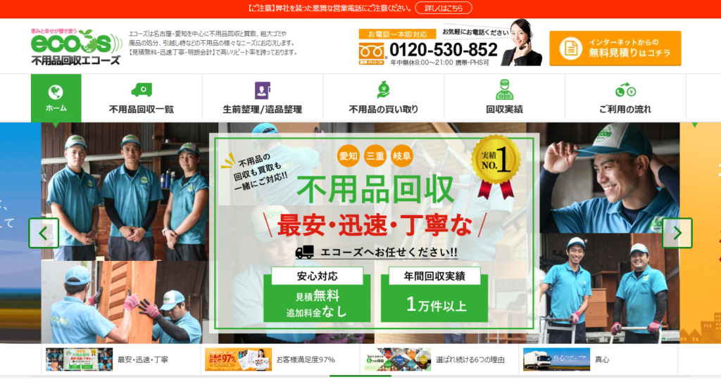 エコーズ(ecoos)は、名古屋市を中心に不用品回収サービスを提供している事業者です。家具・家電などの家庭不用品から、オフィスや事業所の廃棄物まで幅広く対応しています。